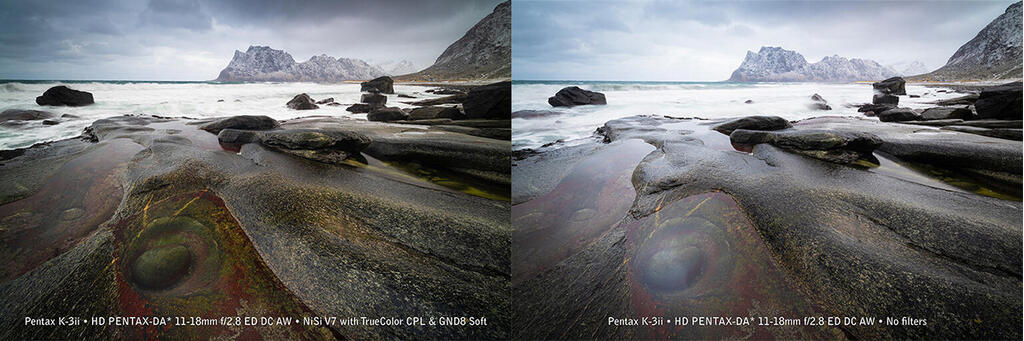 Lofoten. Til venstre: NiSi System V7. NiSi System V7, NiSi Filter Nano IR ND64 (1.8) – 6 stopp, TrueColor CPL og GND8 (0.9 Medium). Til høyre: Uten filter. Foto: Bjørn Joachimsen.