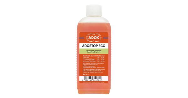 Denne stopper fremkallingsprosessen, noe som hindrer at prosessen fortsetter og dermed skånes fix-kjemien ved å nøytralisere fremkalleren. ADOSTOP ECO er luksusvarianten av et stoppebad. Den lukter ikke bortsett fra en lett sitronaktig lukt, og den indikerer utmattelse ved å endre fargen fra gul til grønn/blå.