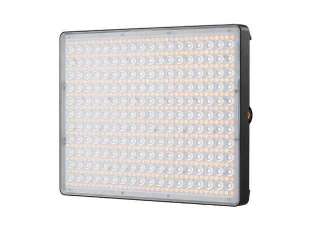 Med sitt optiske design gir panellyset en naturlig mellomstor til sterk effekt samtidig som den opprettholder muligheten til å bli myknet på mindre enn et minutt med den medfølgende sammenleggbare softboksen.
