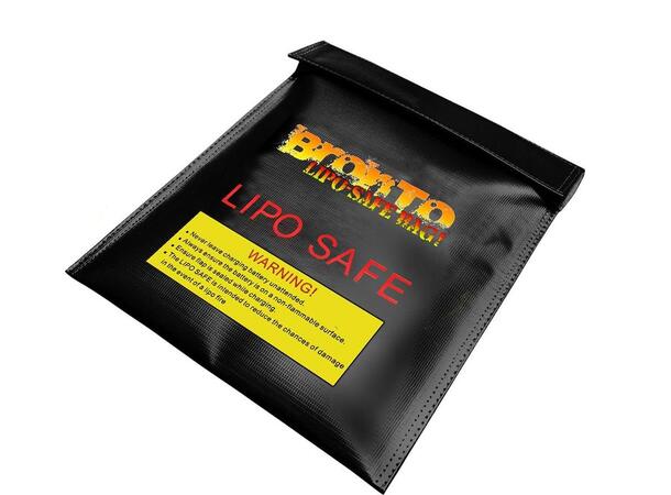 Sikkerhetspose for lading av LiPo. Denne posen anbefales ved lading av LiPo. Ved brann eller stor varmeutvikling vil denne begrense skader og spredning. Du bør fremdeles følge vanlige sikkerhetshensyn når det gjelder håndtering av LiPo, og betrakte dette som en ekstra sikkerhet. Ved lading legges batteriet inn i posen som lukkes godt med en solid borrelås. Ledningene kommer ut gjennom en liten åpning på sidene av borrelåsen.