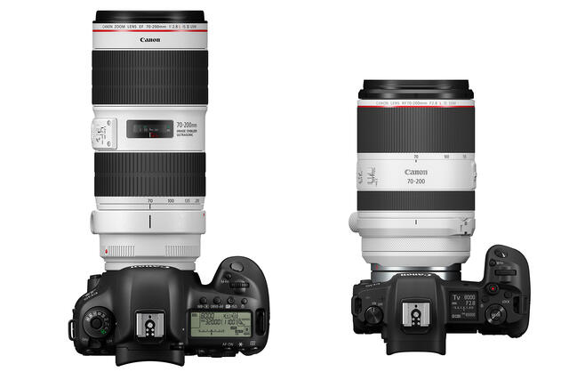 En illustrasjon av vekt- og størrelsesfordelen som introduseres av EOS R-systemkameraer og RF-objektiver. Canon RF 70-200mm F2.8L IS USM- objektivet sammen med et EOS R (høyre) er markant kortere (når det er inntrukket) enn EF-motparten, EF 70-200mm f/2.8L IS III USM sammen med et EOS 5D Mark IV (venstre). Det speilløse oppsettet er i tillegg omtrent 630 g lettere, noe som betyr at du kan pakke med deg ekstra drikke eller et ekstra objektiv for et bredere perspektiv – som for eksempel RF 28–70 mm F2.8 IS STM, som bare veier 490 g, eller 700 g RF 24–105 mm F4L IS USM – og bære omtrent samme vekt som ett EF-objektiv og et speilreflekskamera.