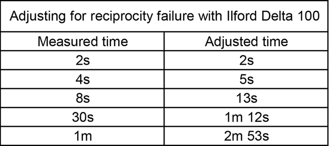 Å fotografere med lange lukkertider kan skape fascinerende effekter, og dette kan du lett oppnå med Delta 100. Imidlertid har alle fotografiske filmer en "indre" motstand mot overdreven eksponering, noe som blir merkbart når du benytter lange eksponeringstider. Denne "langtidsvirkningen" kalles ofte resiprositetsavviket eller Schwarzschild-effekten. Dette innebærer at når du bruker lange lukkertider, typisk lengre enn 2 sekunder, må du legge til ekstra eksponeringstid for at resultatet skal bli korrekt. Langtidsvirkningen virker slik at avviket øker jo lenger eksponeringstiden er. Du kan bruke en formel eller en tabell for å beregne den korrekte eksponeringen i disse situasjonene, men den enkleste metoden er å utføre beregningene ved hjelp av en gjensidig timer-app (iOS) eller lignende smarttelefon-apper.