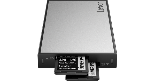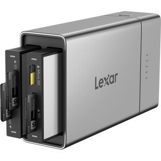 Med Lexar Professional Workflow Dual-Slot SD UHS-II-kortleser kan du laste ut to SD-kort samtidig for en raskere arbeidsflyt. Den leverer en overføringshastighet på opptil 312 MB/s (per spor), har en spesiell ripebestandig aluminiumsfinish, og inkluderer en USB-C til USB-C-kabel og en USB-A-adapter. Den leveres også med en bekymringsfri 3-års garanti.