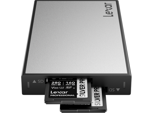 Lexar Professional Workflow Dual-Slot SD UHS-II-kortleser med to SD-kortspor gjør at du kan laste ut to SD-kort samtidig for en raskere arbeidsflyt.