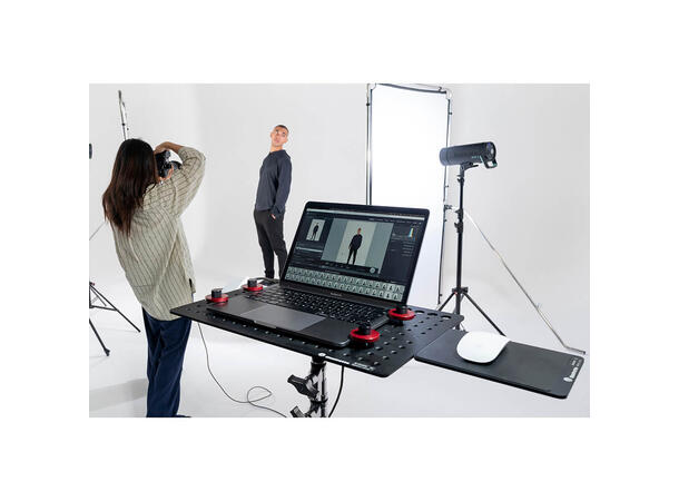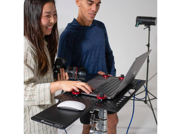 Manfrotto TetherGear PC-nettbrettplate er en ultrastabil plattform designet for å montere bærbare datamaskiner trygt og sikkert på toppen av grep og støtteutstyr som lysstativ, kamerastativ og støttearmer.