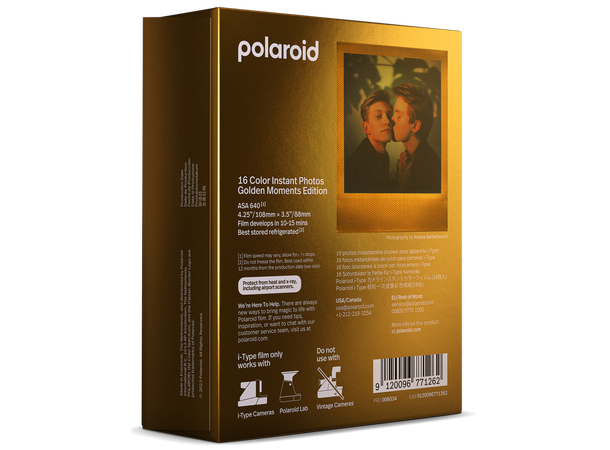 16 øyeblikksfotografier i farger med glatt gullfinish for Polaroid i-kameraer. Bildet begynner å fremkalles direkte, og de første tegnene på bildet er synlige etter et minutt. Bildet er ferdig fremkalt etter 10-15 minutter.