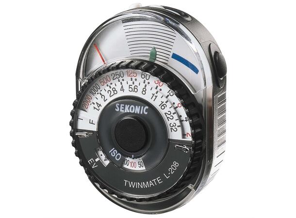 Sekonic L-208X TwinMate, analog lysmåler for håndholdt lysmåling av innfallende og reflektert lys. Lysarmaturen kan også monteres på kamera eller tilt-led med den medfølgende hot-shoe-adapteren. Selv om L-208X TwinMate først og fremst er designet for nybegynnere innen fotografering, fungerer den også utmerket som en presis, kompakt reservelysmåler.